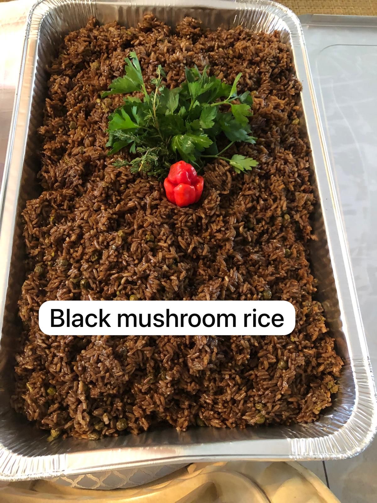 A rich and flavorful black mushroom rice catering tray seasoned with herbs and island spices. Perfect for elegant dinners, parties, birthdays, and family catering events.